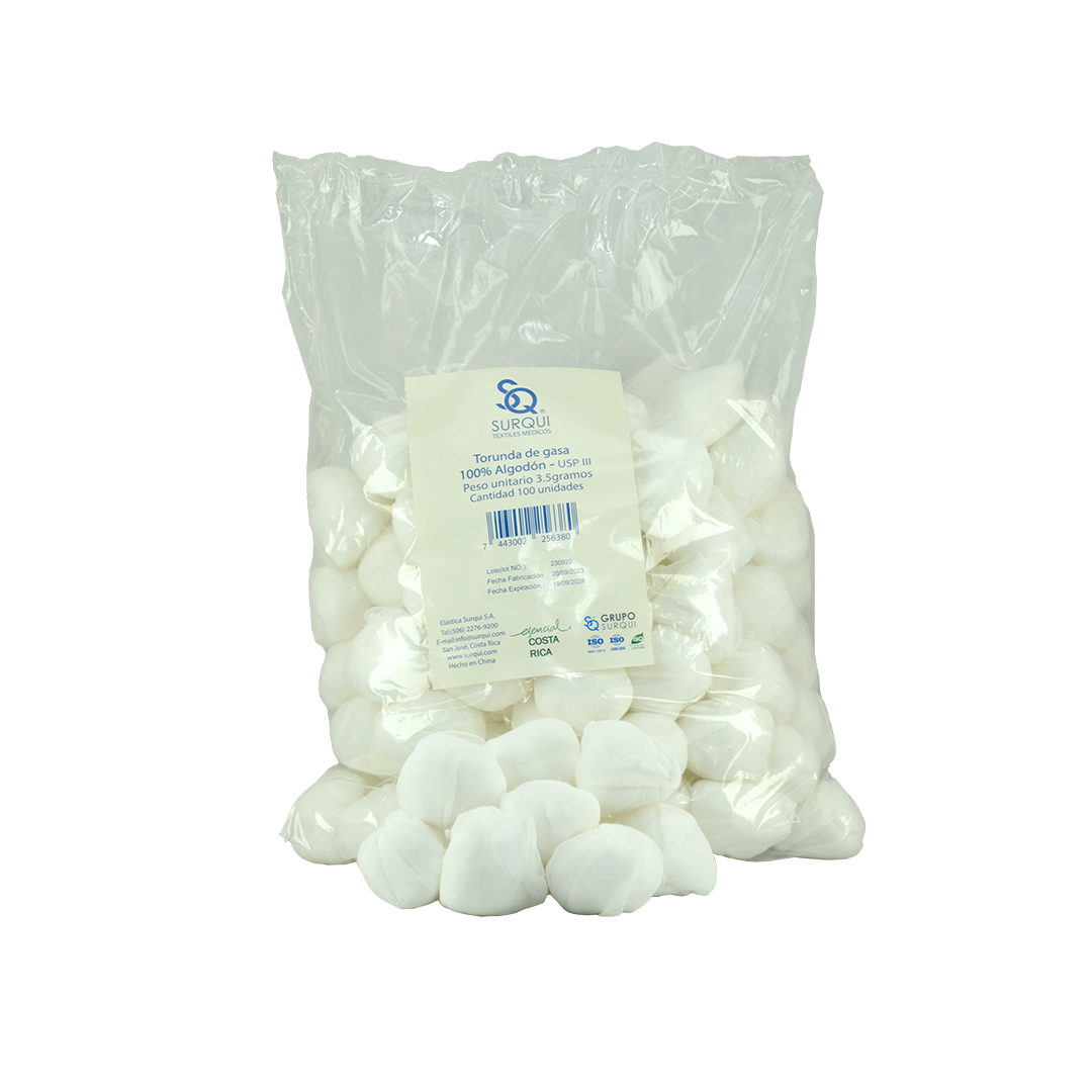 Consiste en un cuadro de Gasa doble 100% algodón, doblados entre sí para conformar una torunda redondeada, con todos sus extremos sujetos por el mismo material.